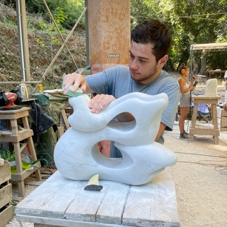 The “Marble S" Sculpture is hand carved out of Carrara Marble. The piece was hand sculpted in Pietrasanta, Italy with the guidance of talented artisans. The subject of the piece, the letter "S", stems from the 3-Dimensional STAV6 graffiti letters carried throughout Tavill's work. The form flows through the stone playing into the beautiful veining of the natural marble.