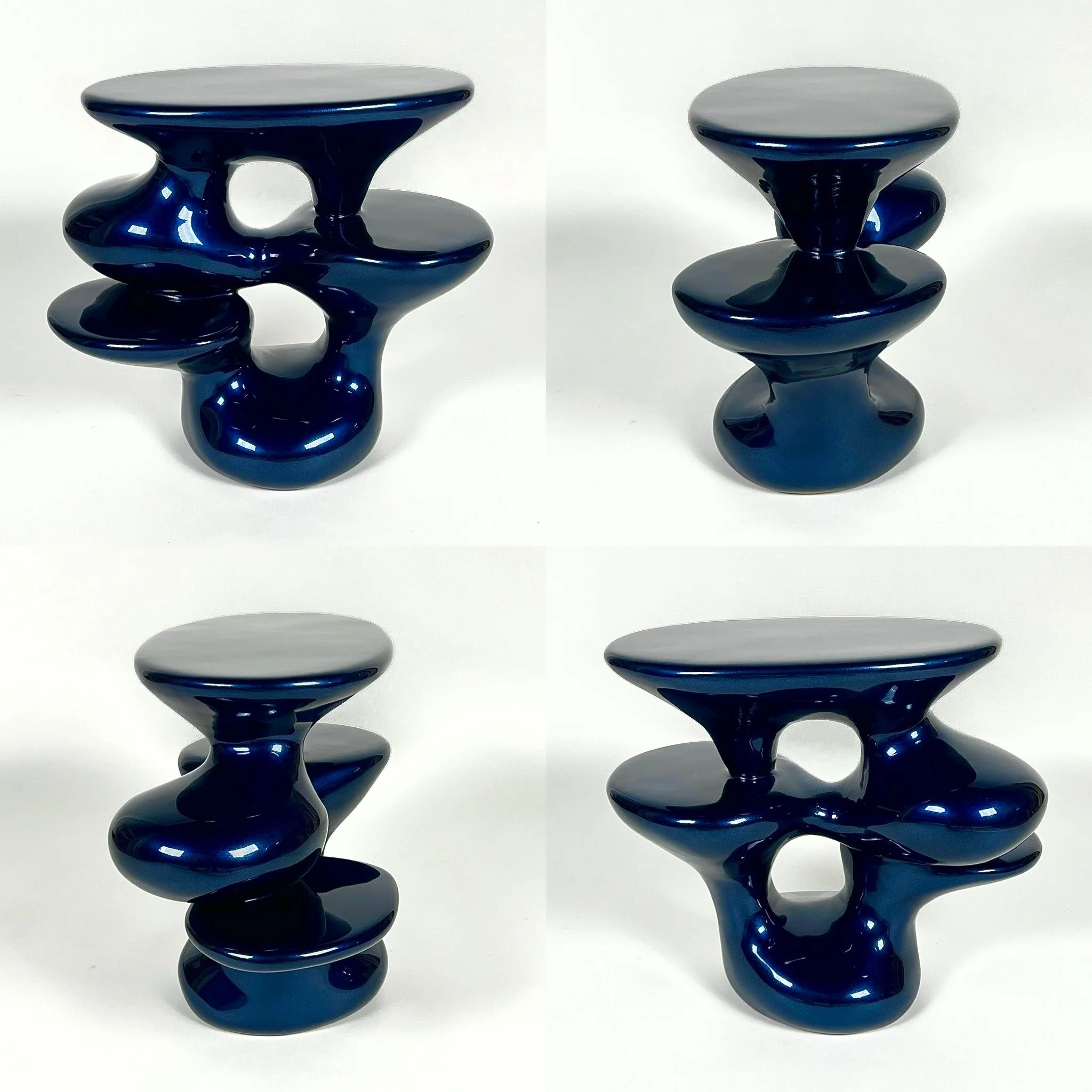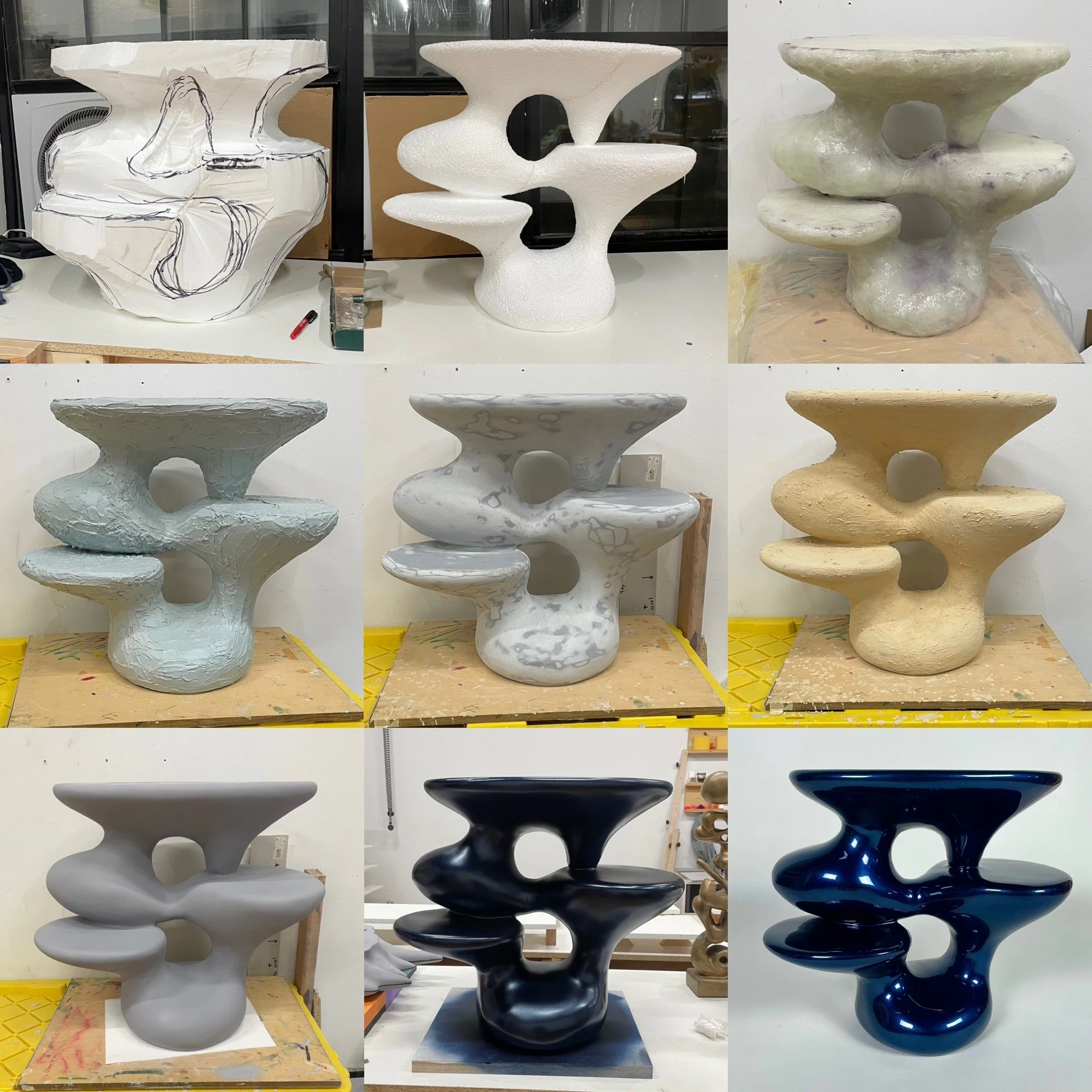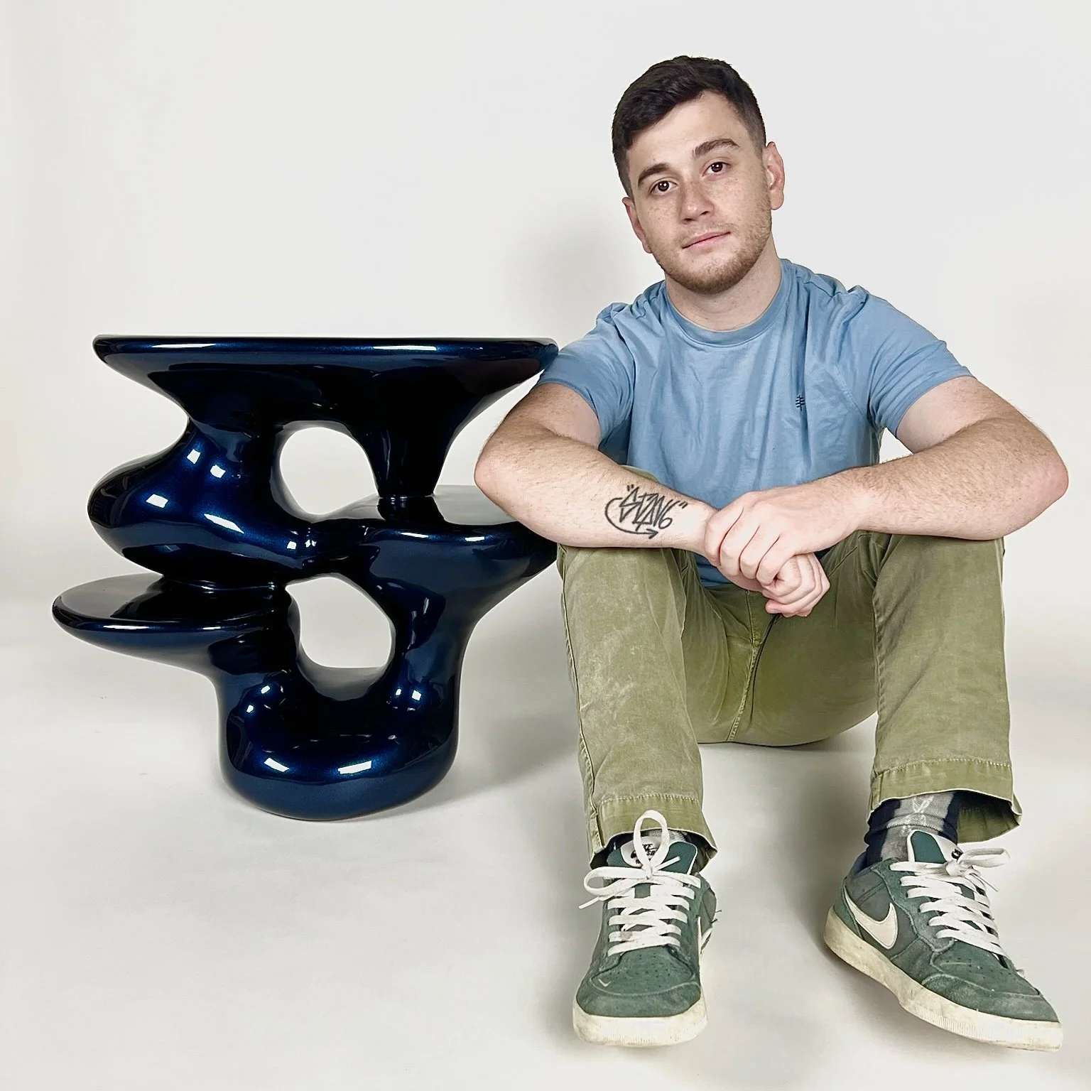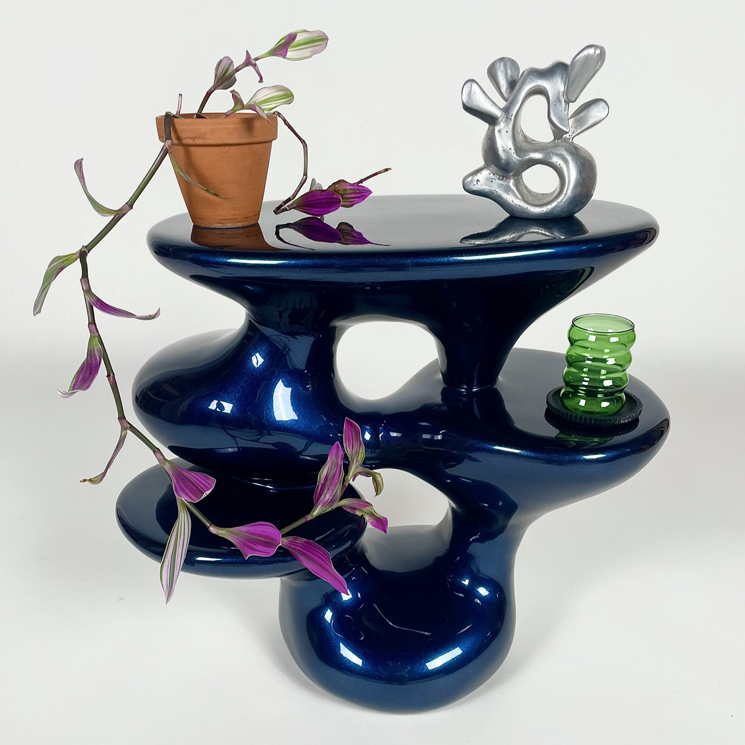 The "S" Side Table is a sculptural, hand-carved side table made from recycled foam, reinforced with fiberglass, and finished in high-gloss automotive paint and clear coat for lasting strength. The form abstracts from the "S" motif traditionally used by Tavill. Its three organically connected tiers create a versatile, functional surface that seamlessly merges utility with artful design. Its sleek design allows the user to observe all its beautiful motion through its flowy curves.