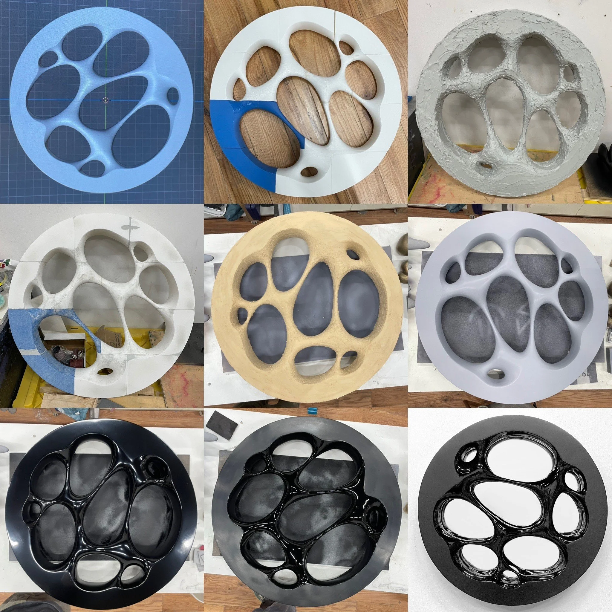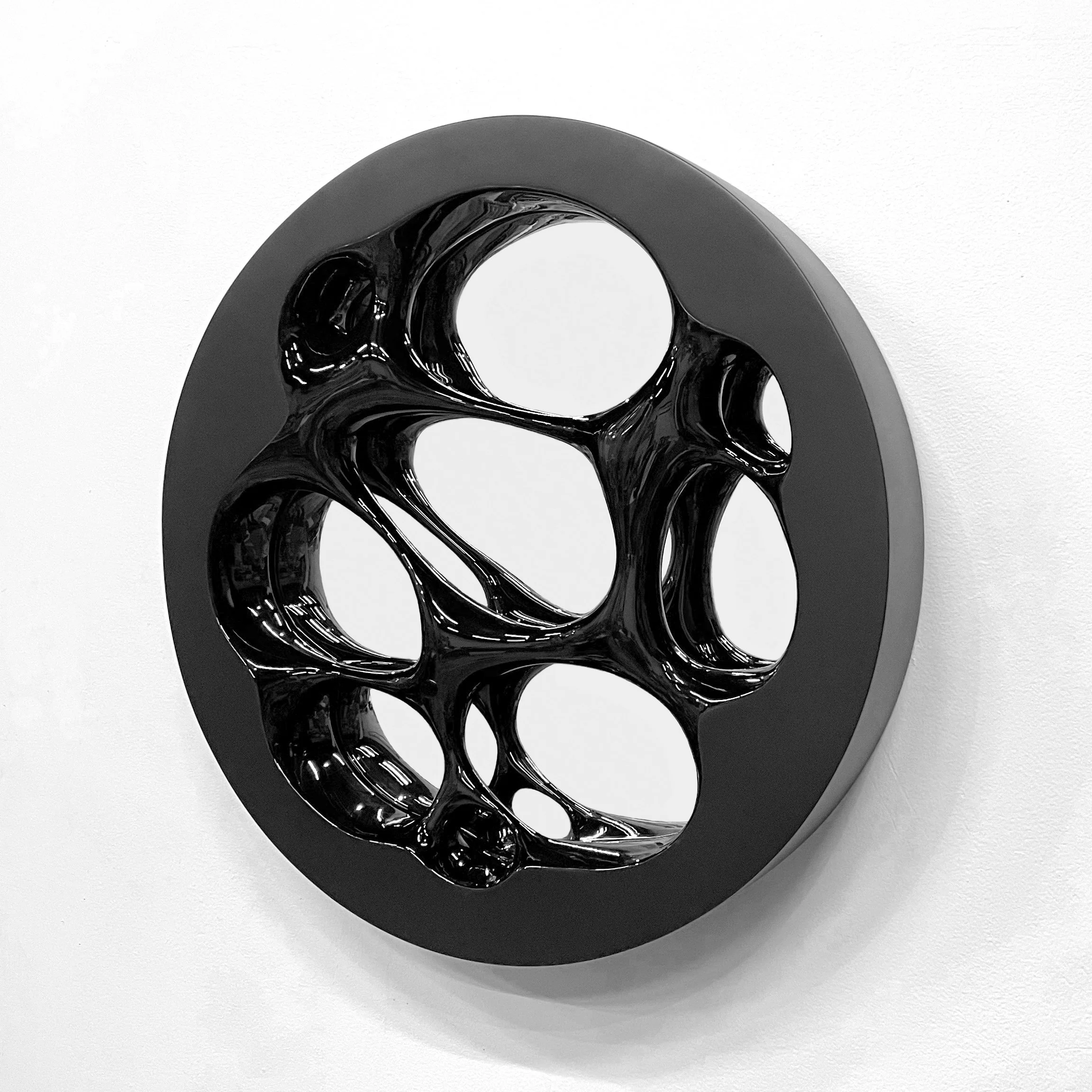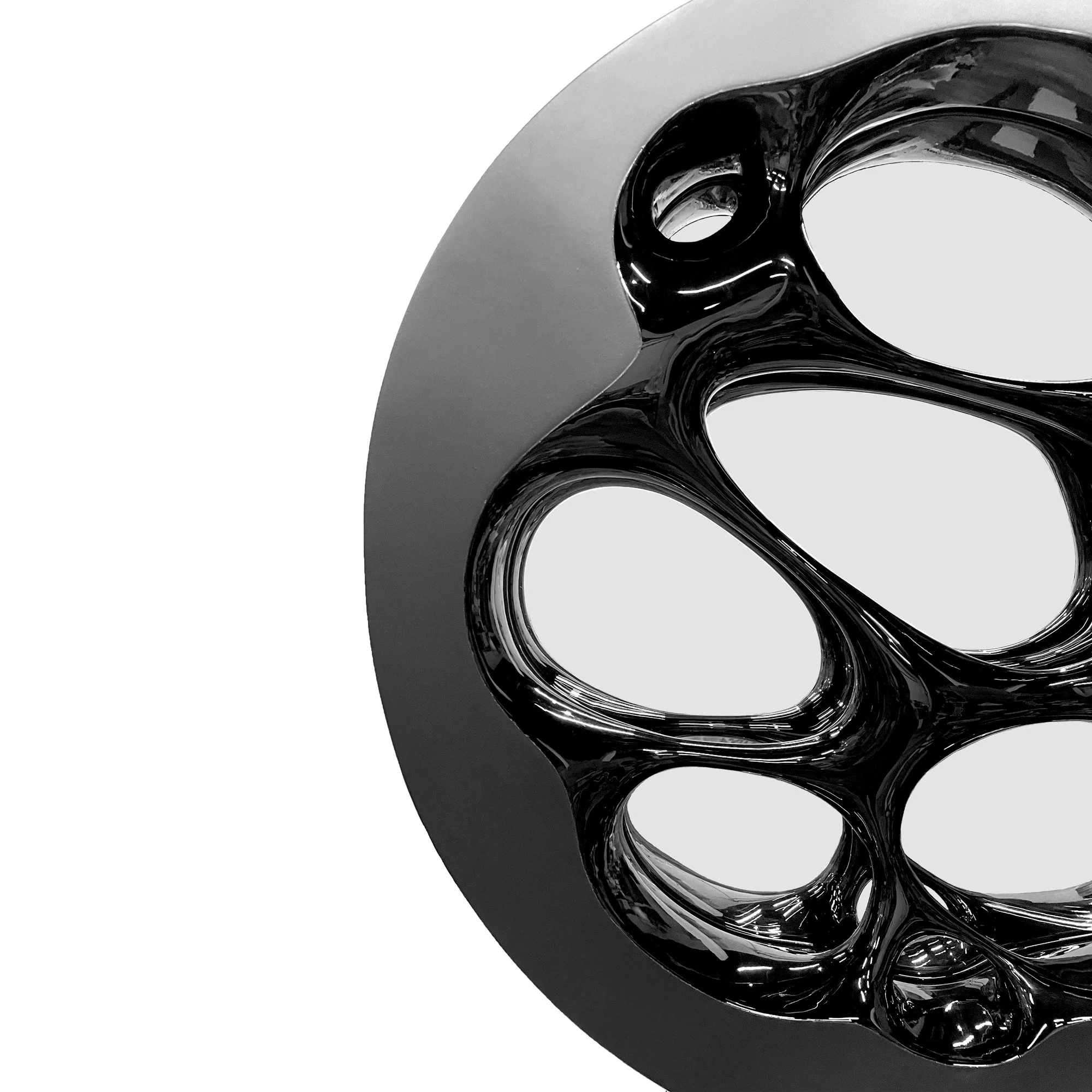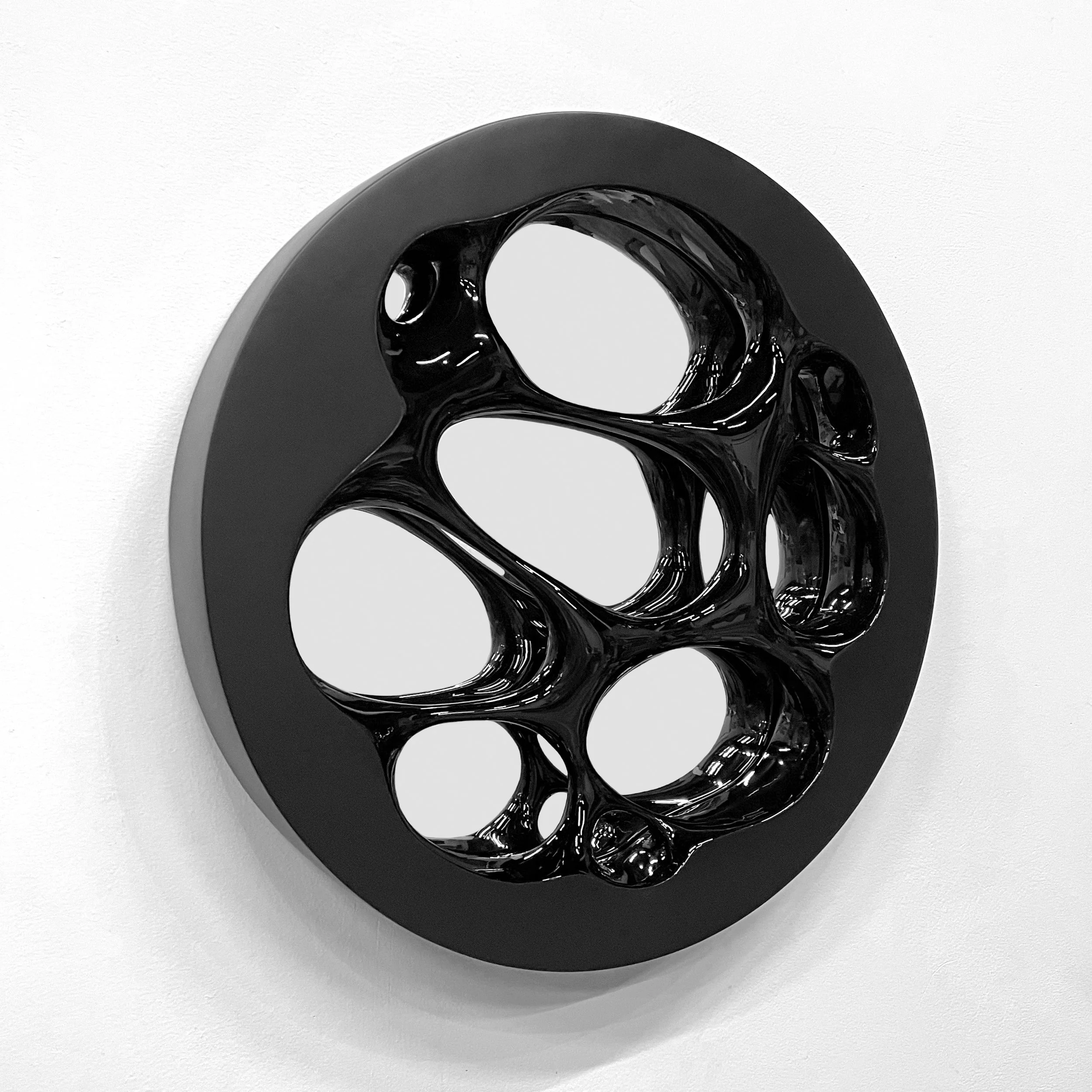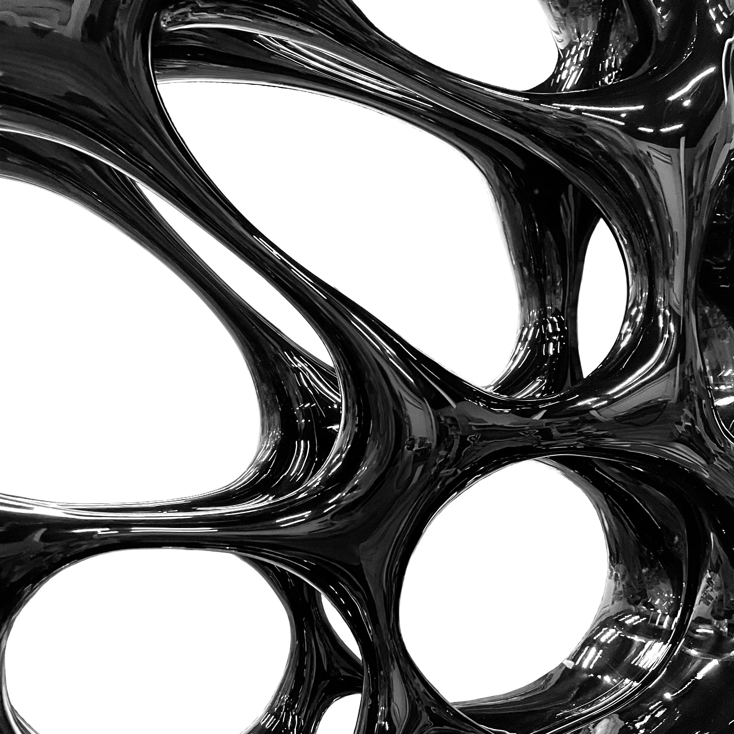 The Sticky Mirror is designed to evoke a sticky - slimy sensation, inviting the observer to explore the contrast between textures. The clean matte outer edge and front plane sharply oppose the high-gloss, organic forms within, creating a captivating dynamic quality. It is meant to feel as though a pipe had been sliced open, revealing the viscous, stretching, ominous goo inside. The separations in the mirror allow for unique framed moments for the user to appreciate.