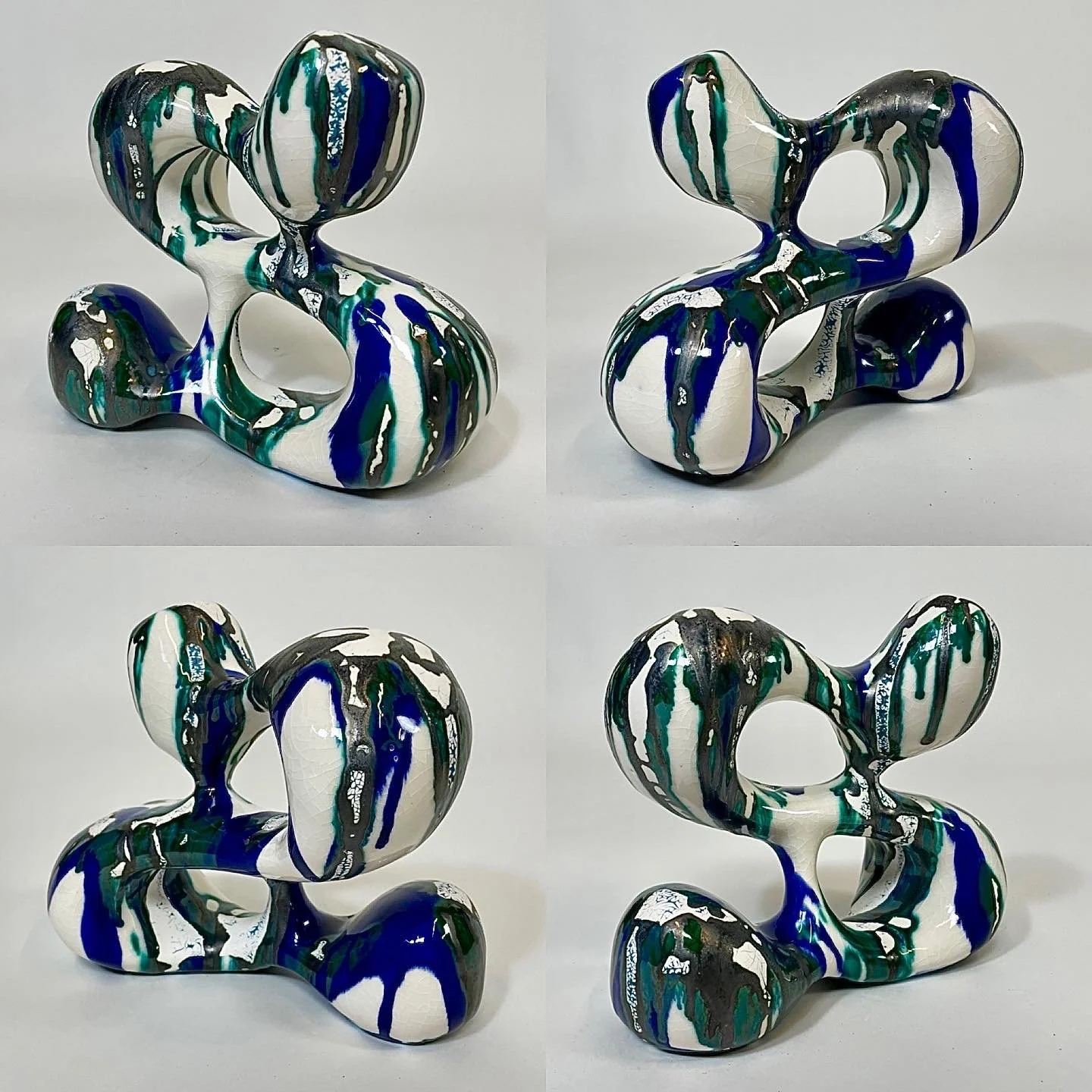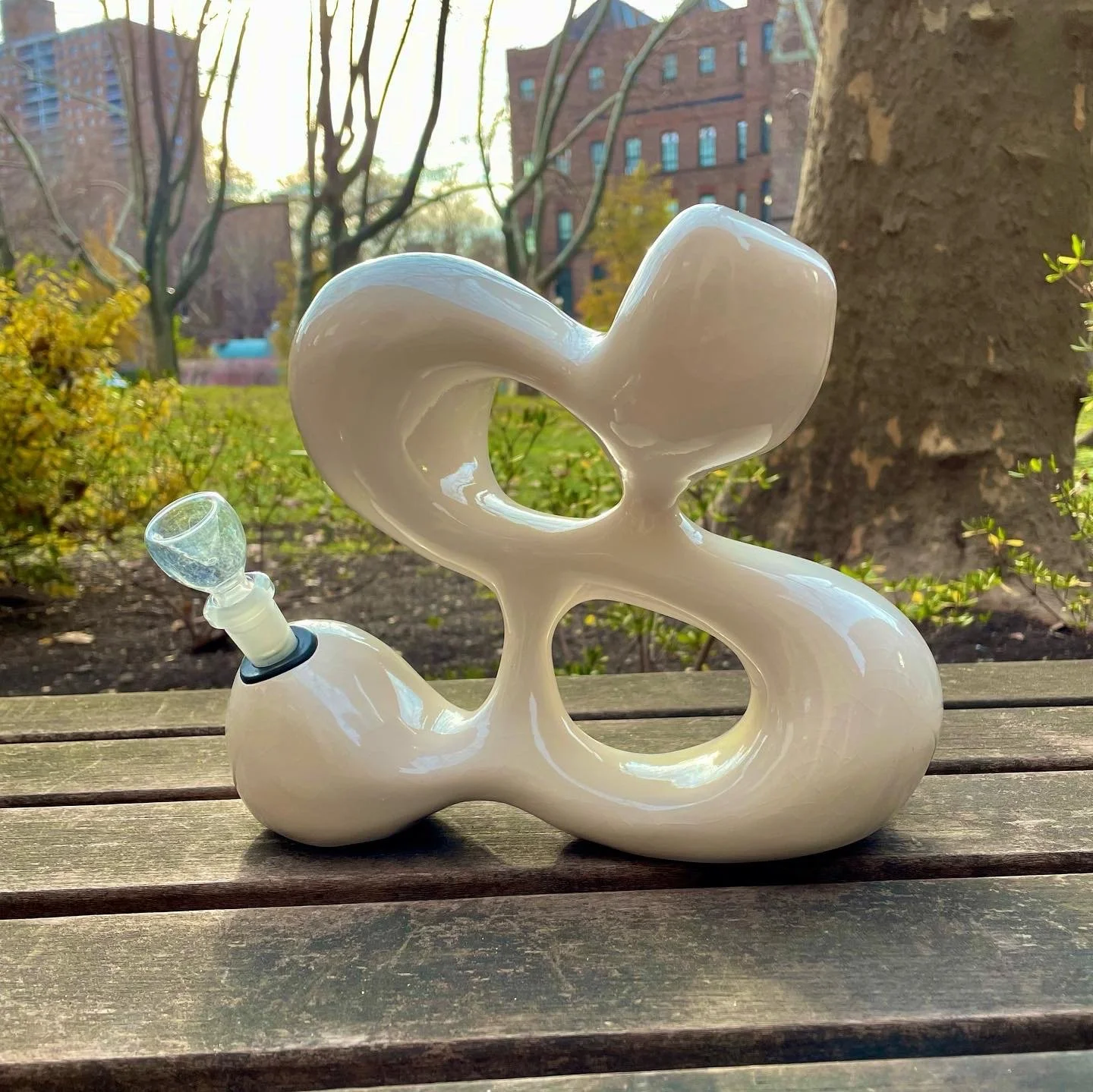 The "Sticky S" series are slip-casted out of porcelain and fired with different glazes. The design can either be a sculpture or a functional bong (water pipe). The organic form of the piece is meant to evoke a sticky - gooey like effect on top of Tavill's signature 3D graffiti "S" motif. The series includes multiple different finishes on top of the slipcast form allowing each piece to have its own unique attributes.